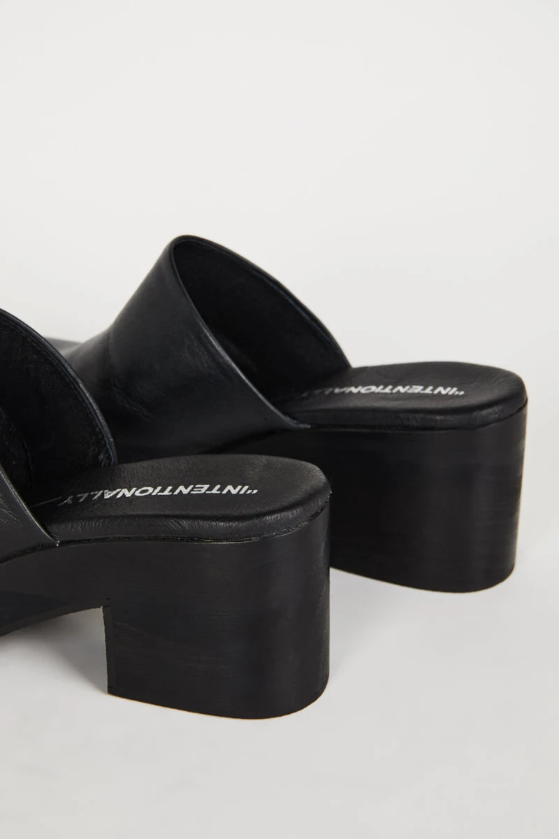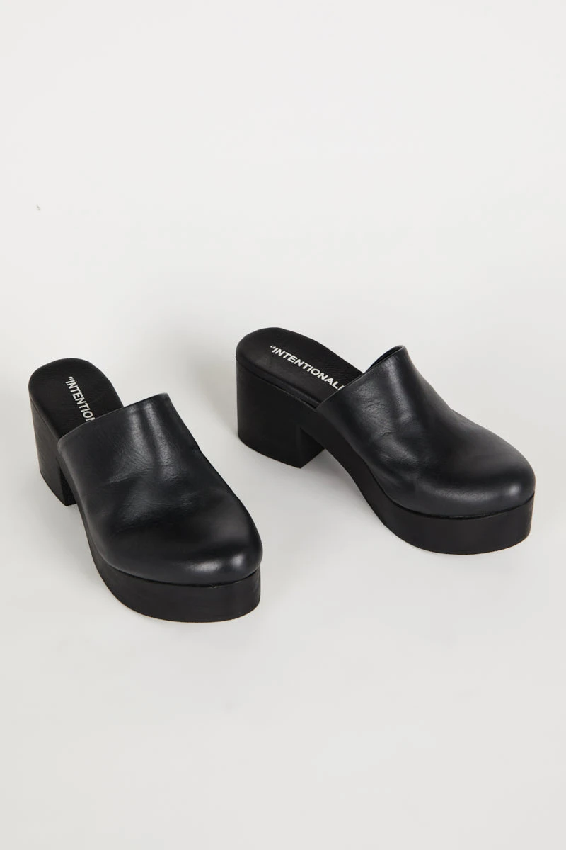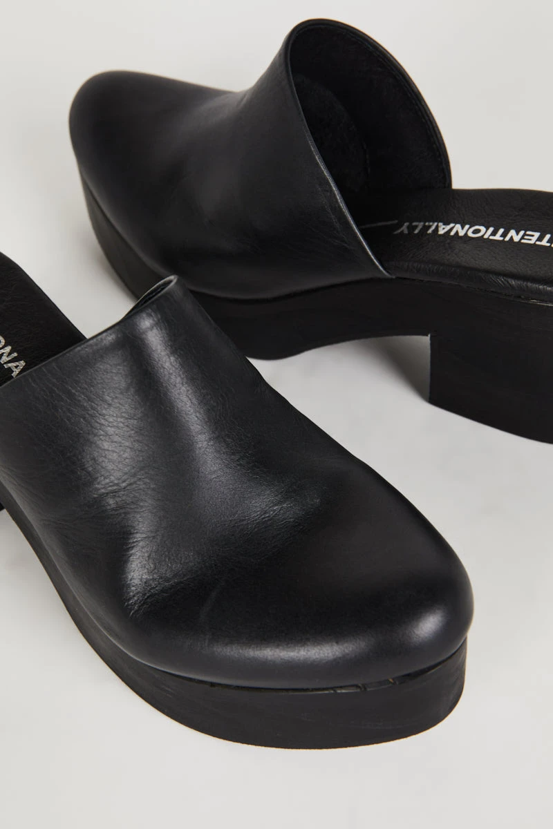 Vintage inspired wooden clog with classic leather upper and a slightly pointed toe. Classic clog details with the perfefect low heel and platform.
