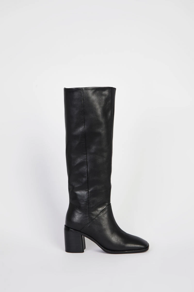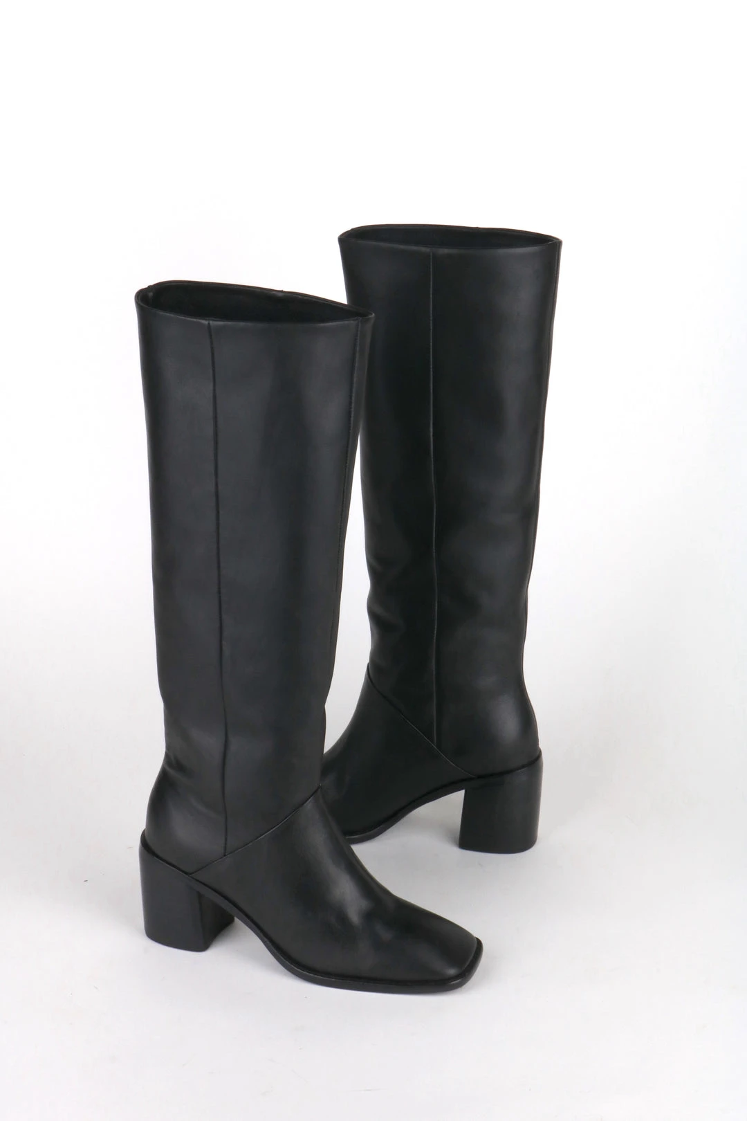 A tall boot that is different. We love the combination of the square two with the straight shaft, wear it bunched down, or tall and straight.