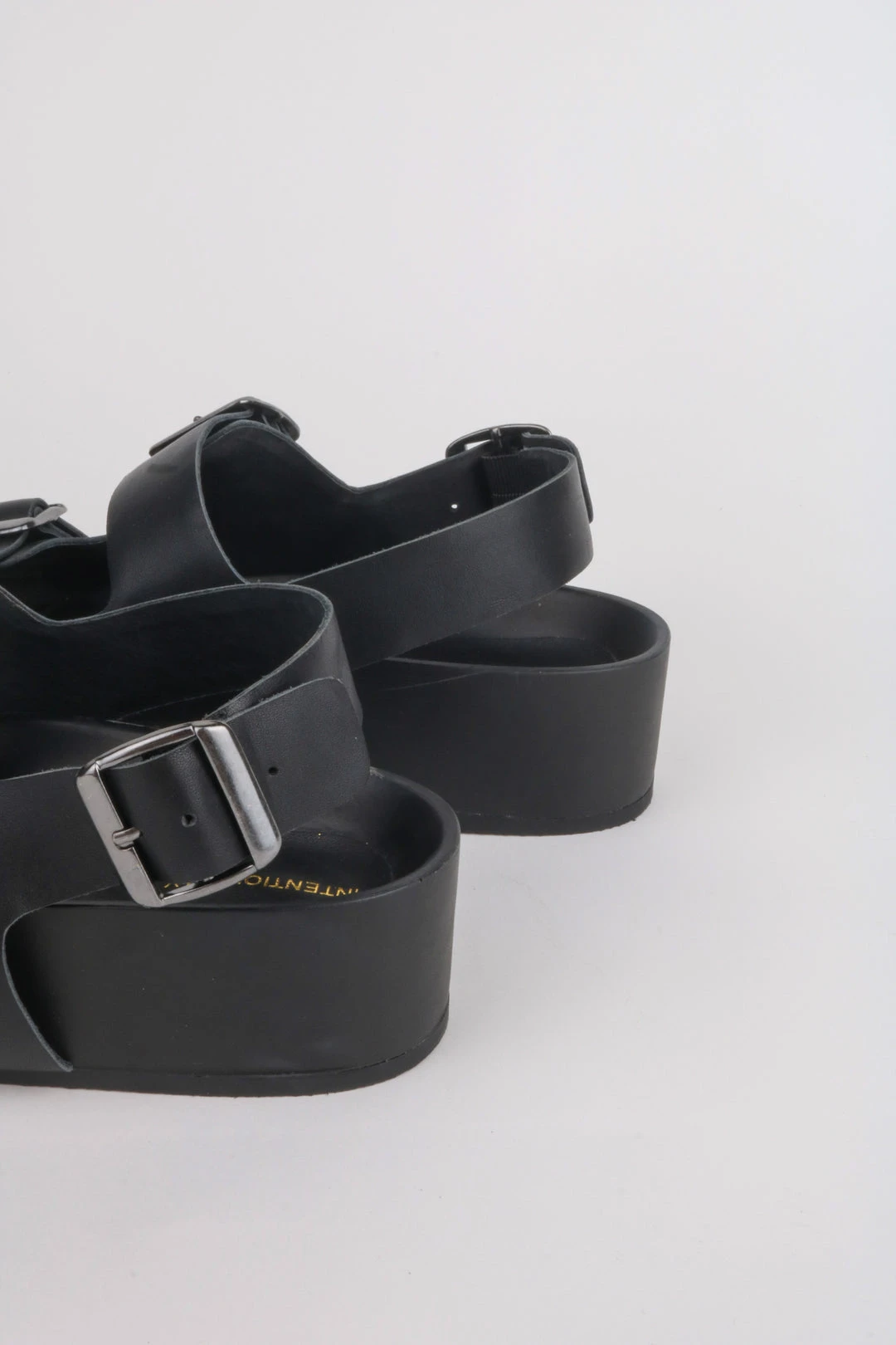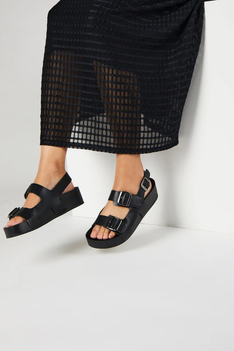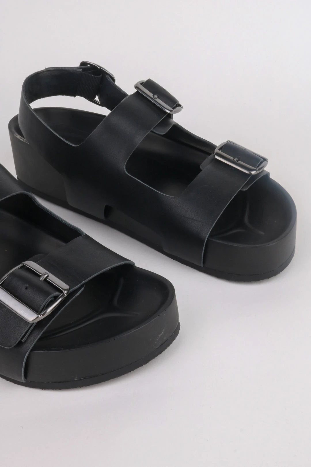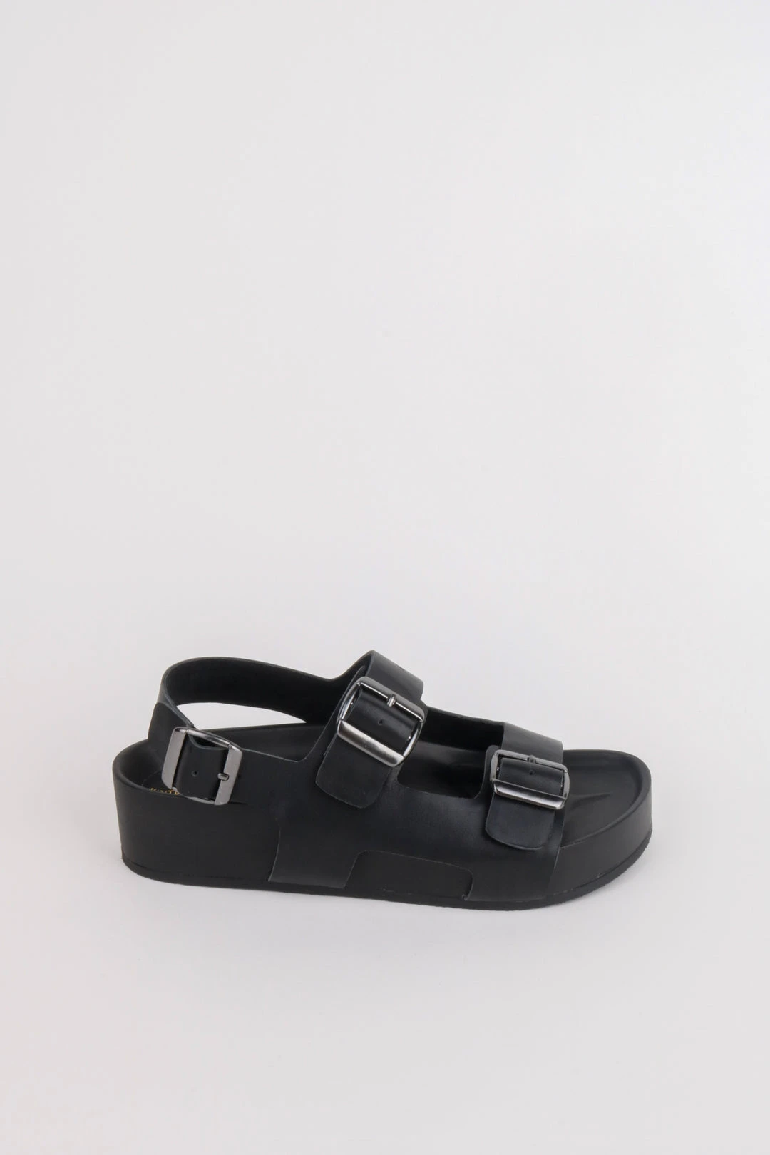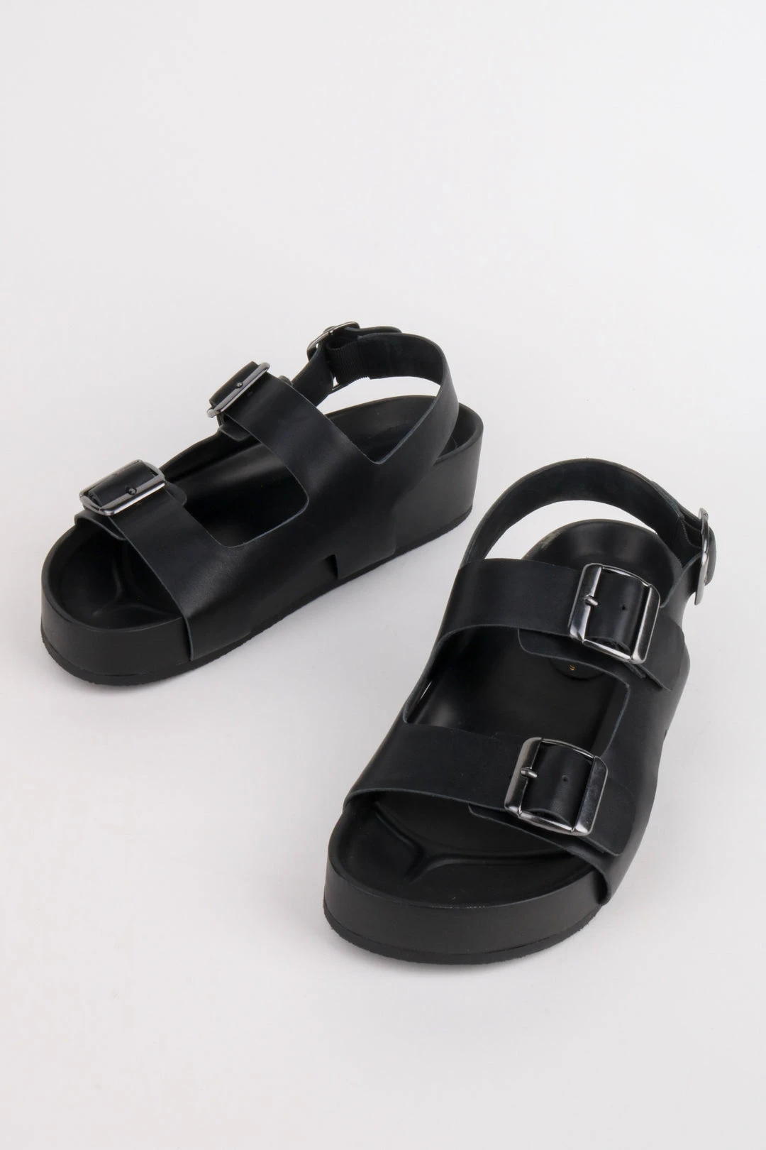 Obsessed with this minimal two buckle sandle with back strap. We love the overlasted straps that piece into the sole of this low rise flatform.