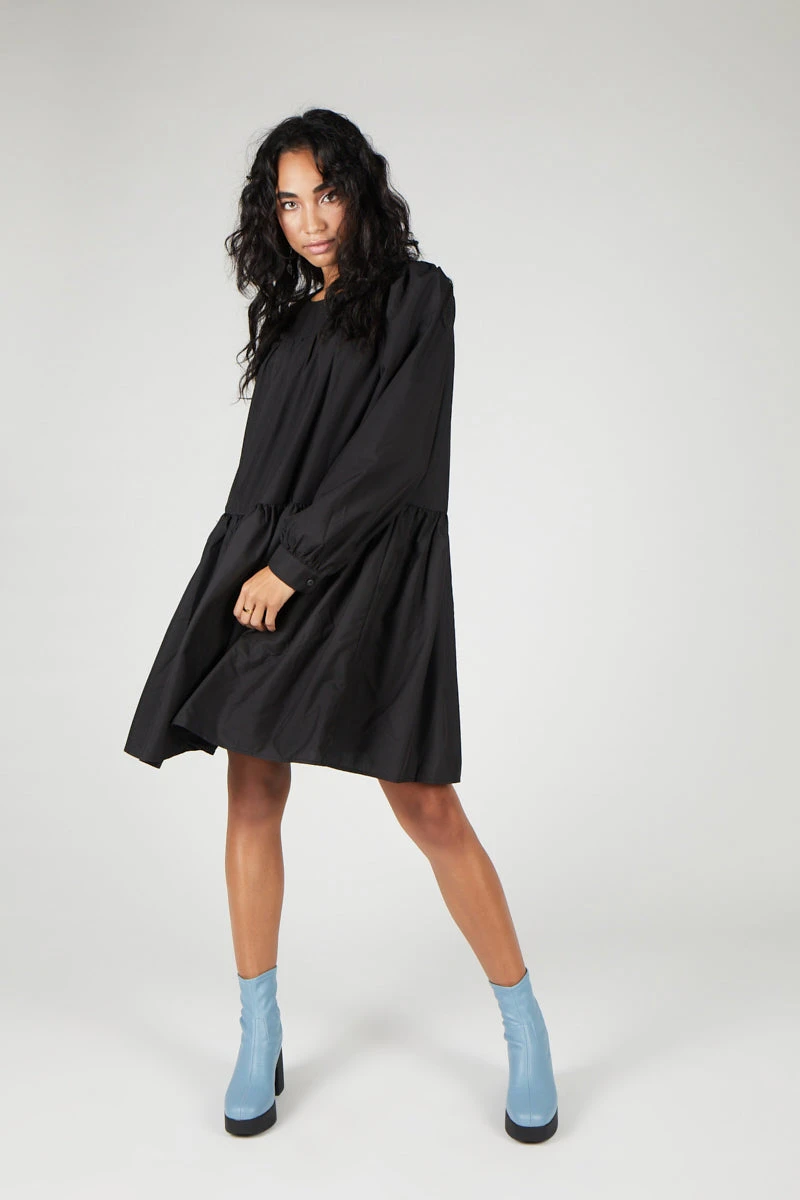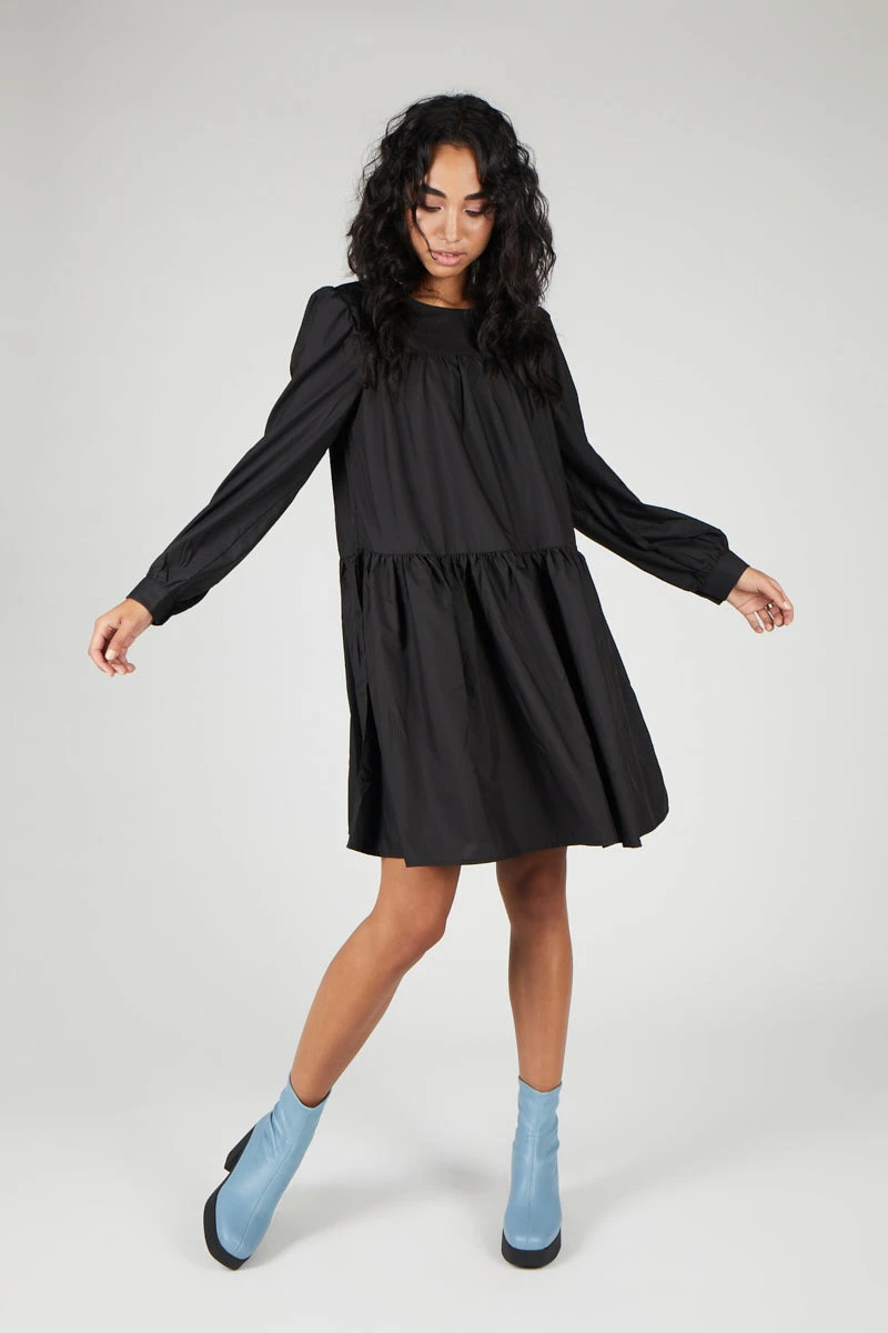 This tiered babydoll with long sleeves and a small shoulder puff is an effortless toss on for transitional dressing and can be styled up or down.
