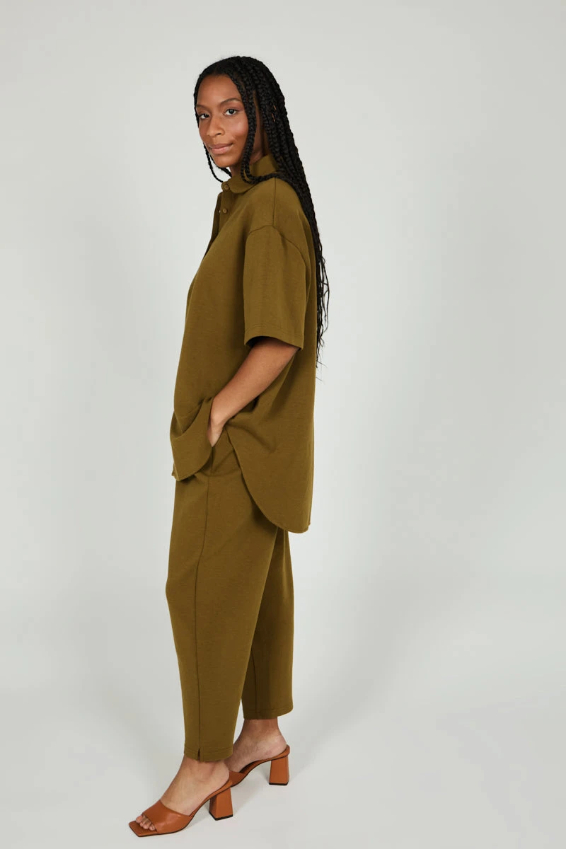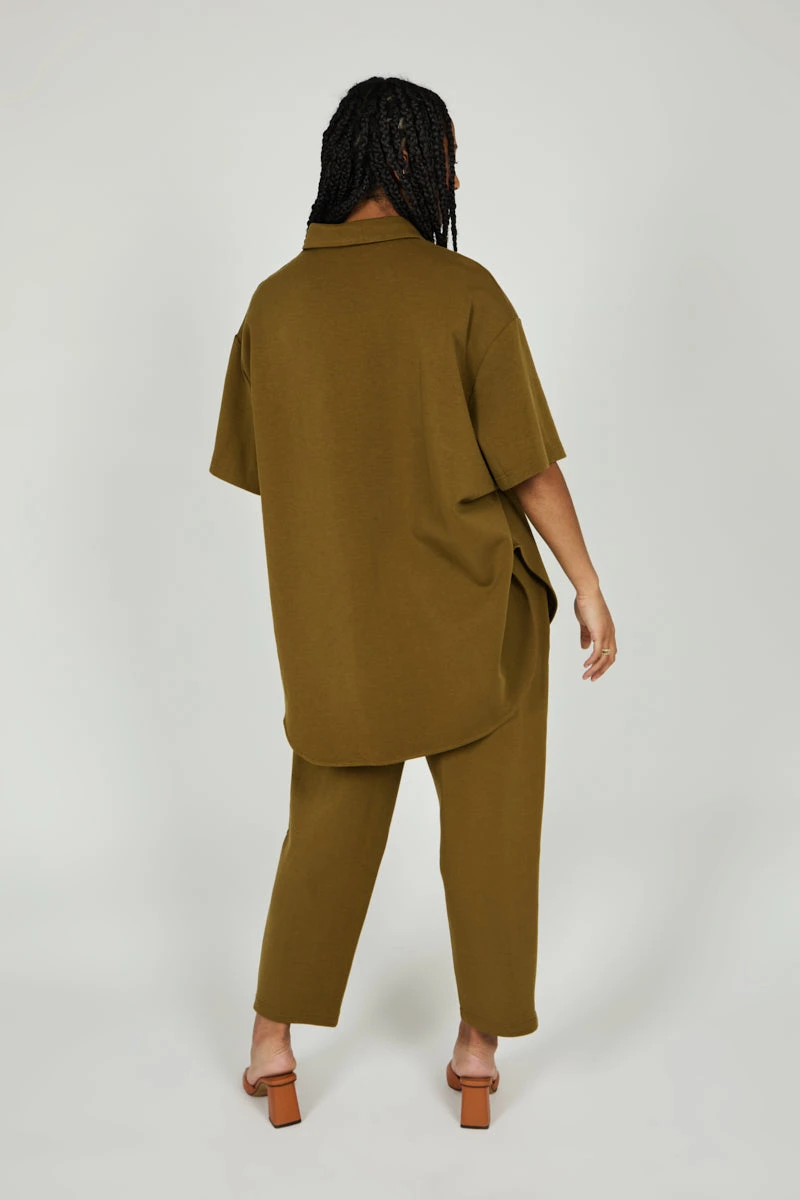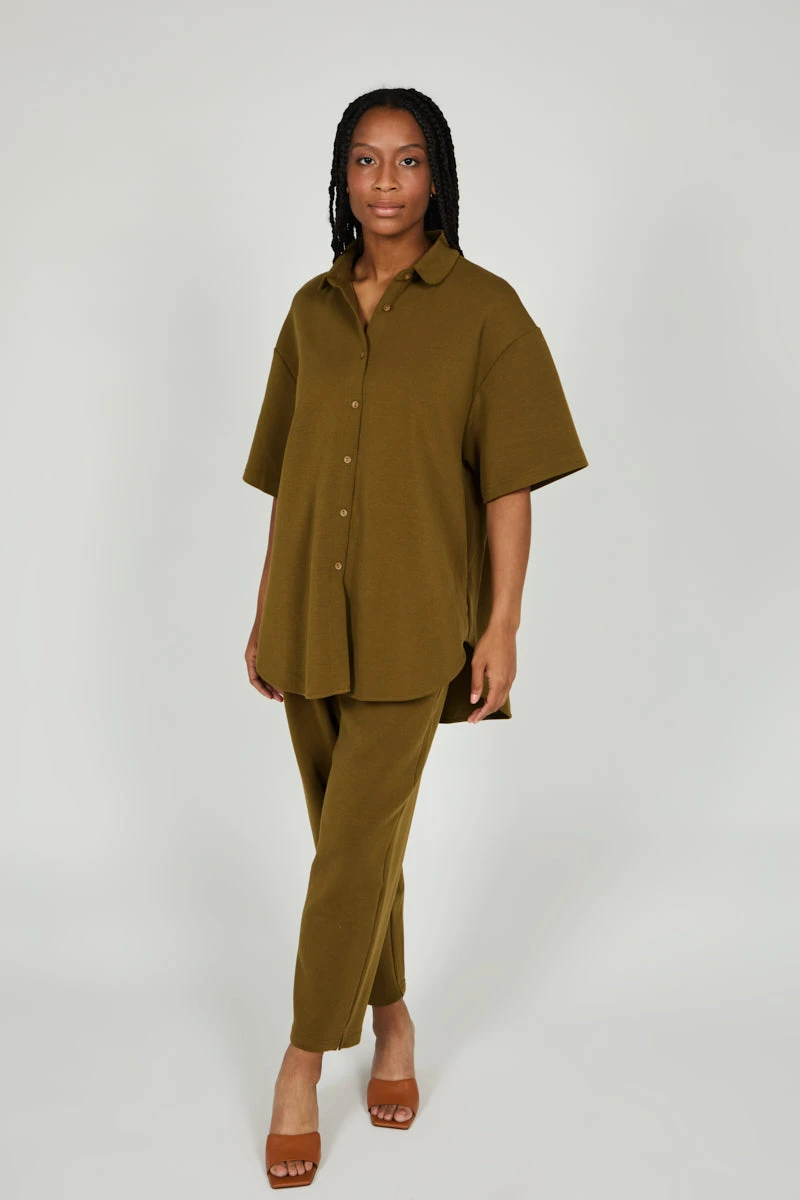 The perfect unisex button down monochromatic set. Boyfriend vibes pairing soft shoulder details, classic button front closures, small modern collar paired back to the perfect matching relaxed pant.