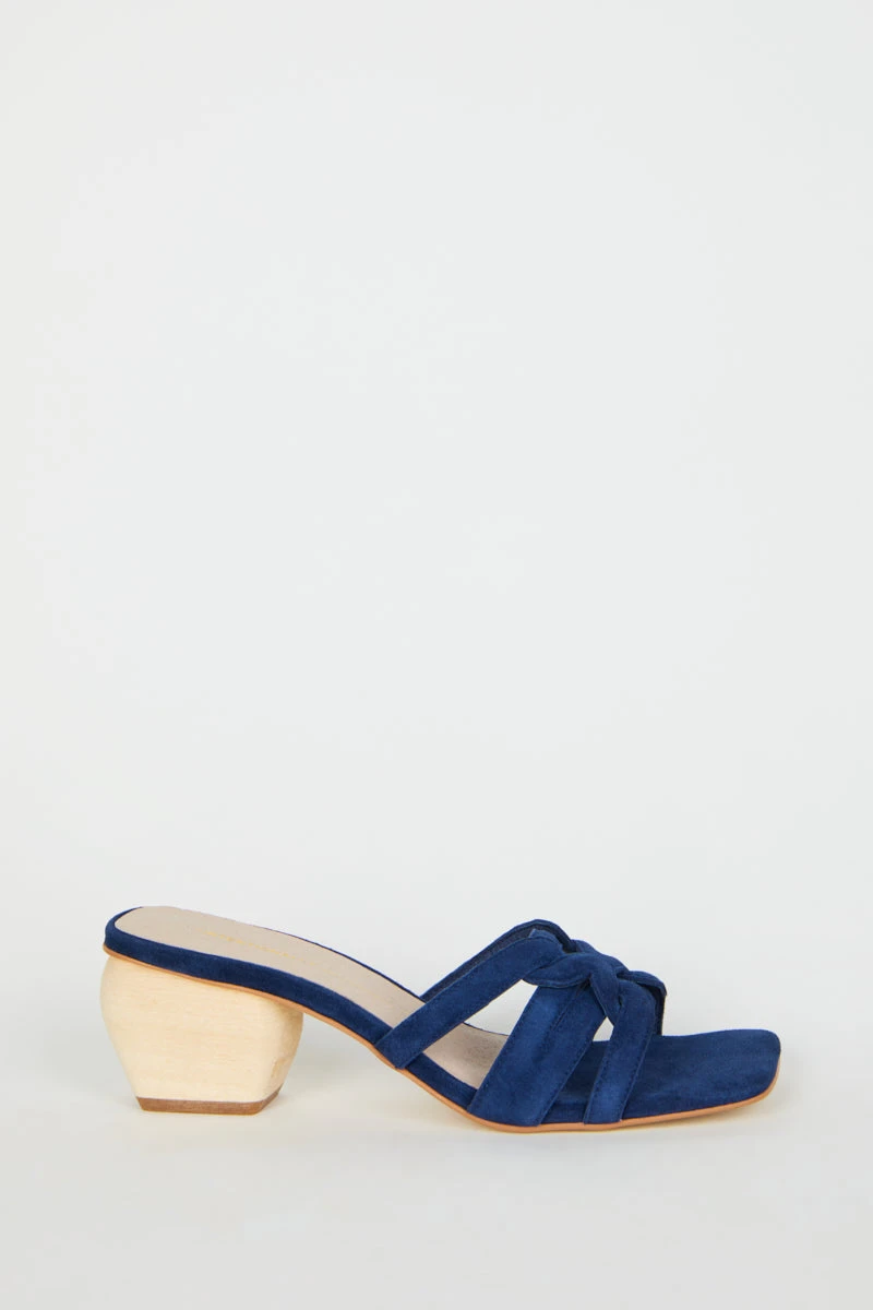 Soft suede interlocked straps on the perfect natural wood heel create the most chic vintage inspired slip on heeled sandal.