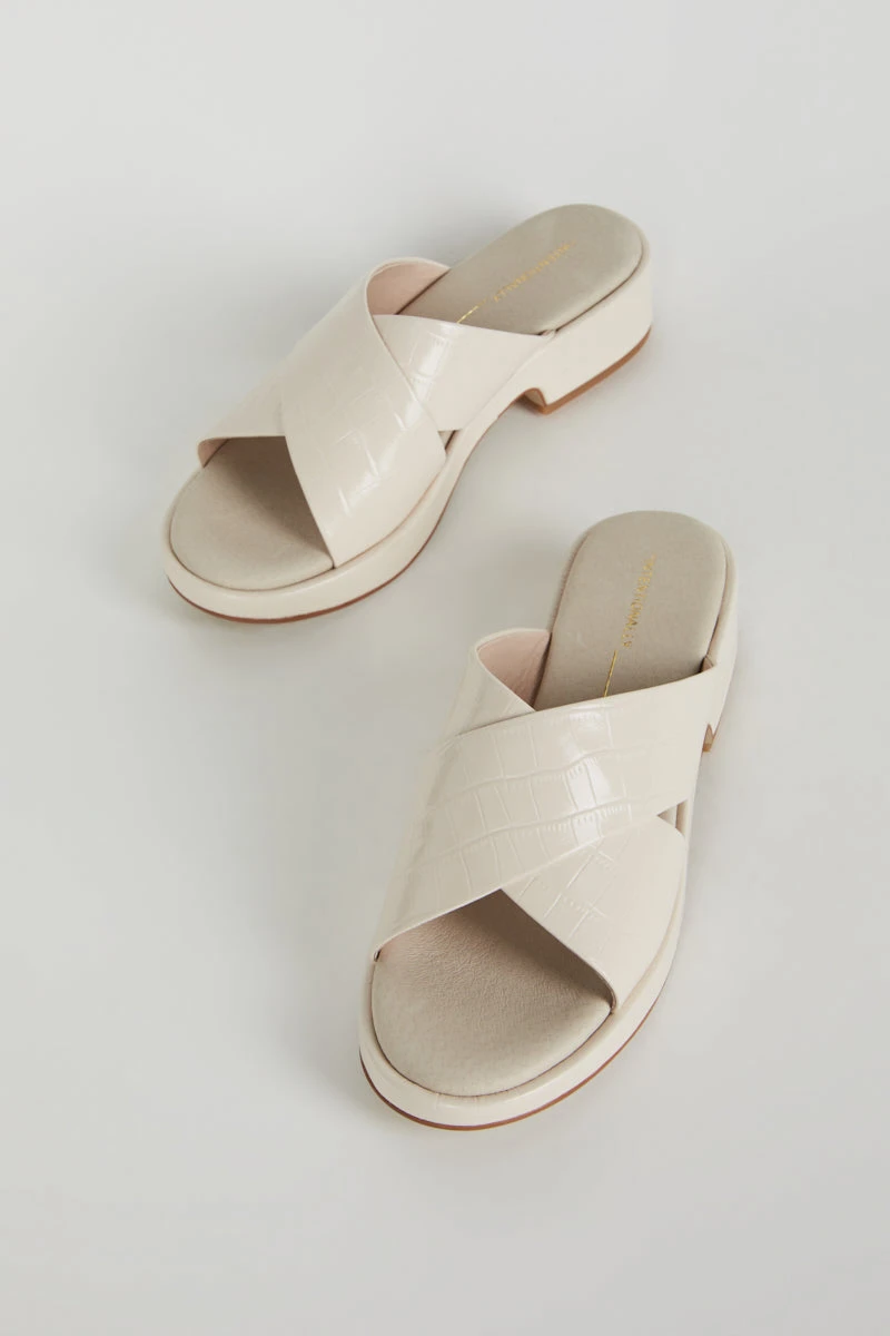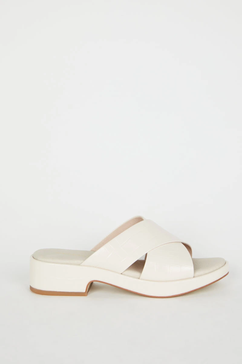 Low and easy this cross band sandal in embossed croco is the perfect warm weather toss on. Meet VONDA, fall in love.