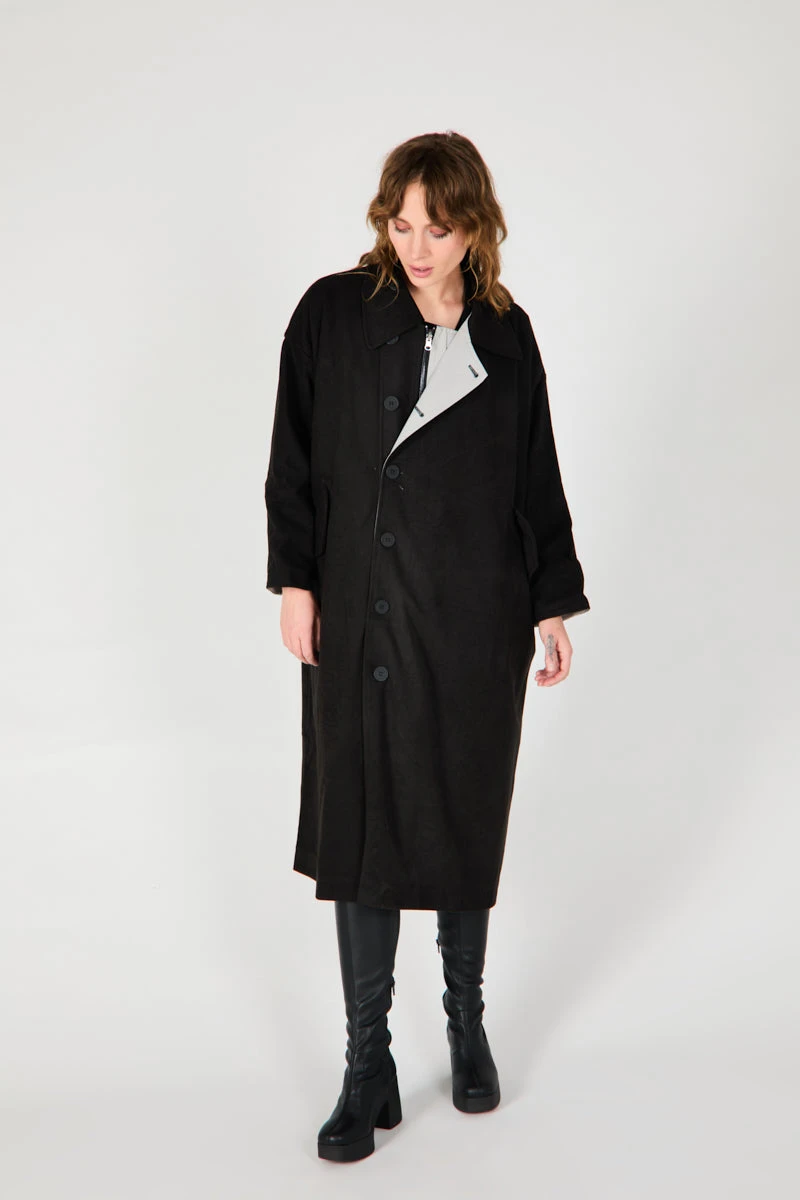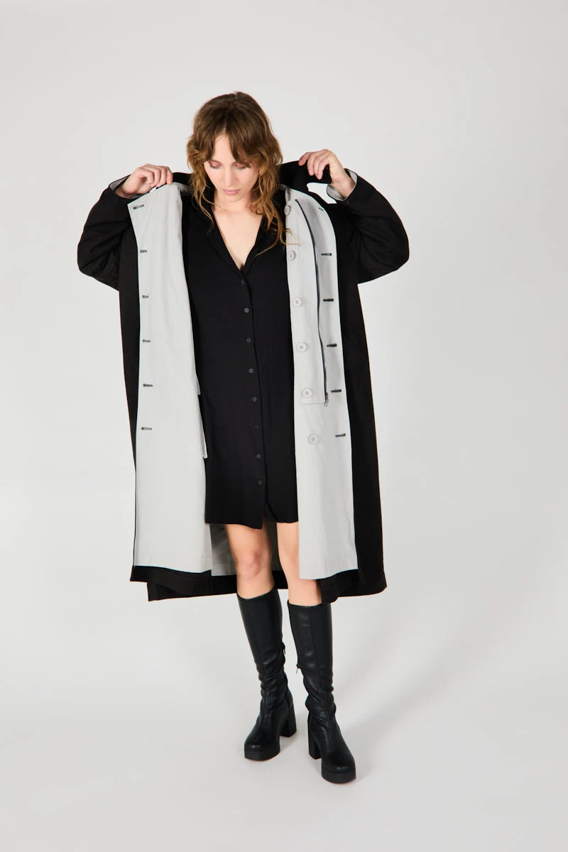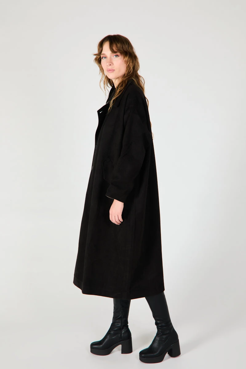 Heavy weight belted trench, the PETERS combines a relaxed fit and tie belt detail to create the ulitmate fall staple. Asymetrical button detail, fully lined and belted, outter material is fleted cotton for added cozy vibes.