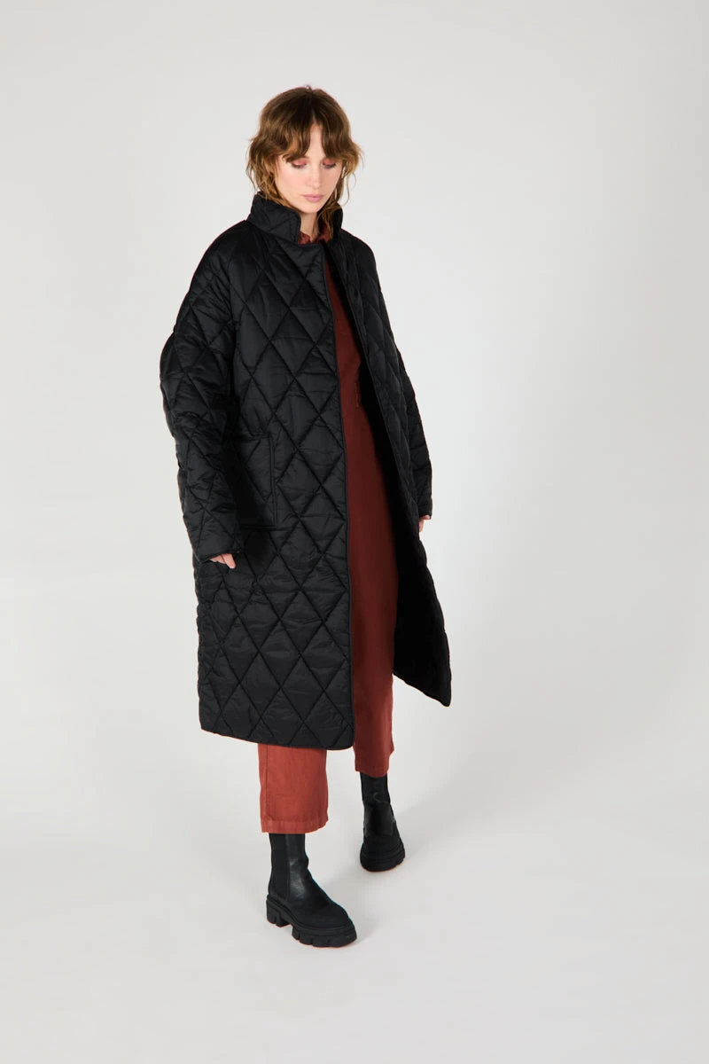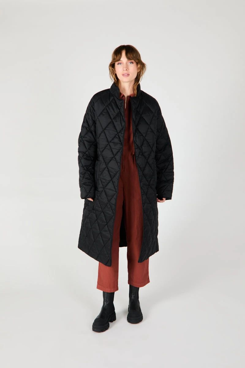 This house robe inspired quilted coat is perfect for fall styling. Whether you style it open with a pop of color underneath or bundled up and cozy, this coat is sure to be your new fave.
