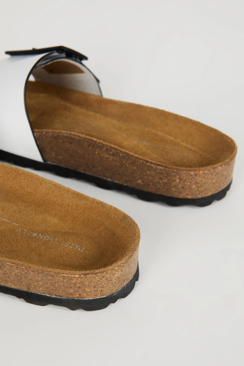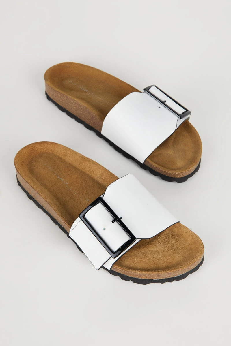 Keep it minimal with this summer slide. Made in Spain, this simple bio footbed slide is made fresh with a nod-to-mod with the detail of this oversized buckle. Slip on and go forward with style without compromising comfort.