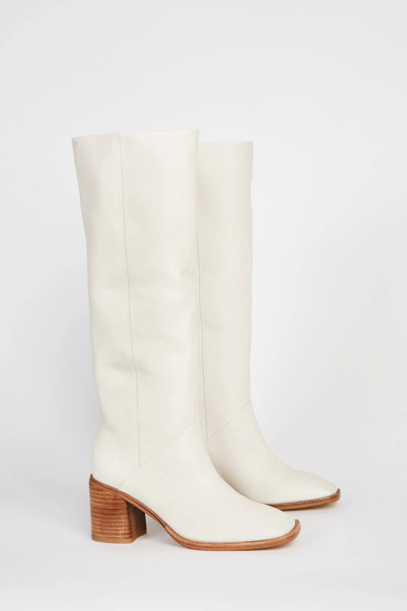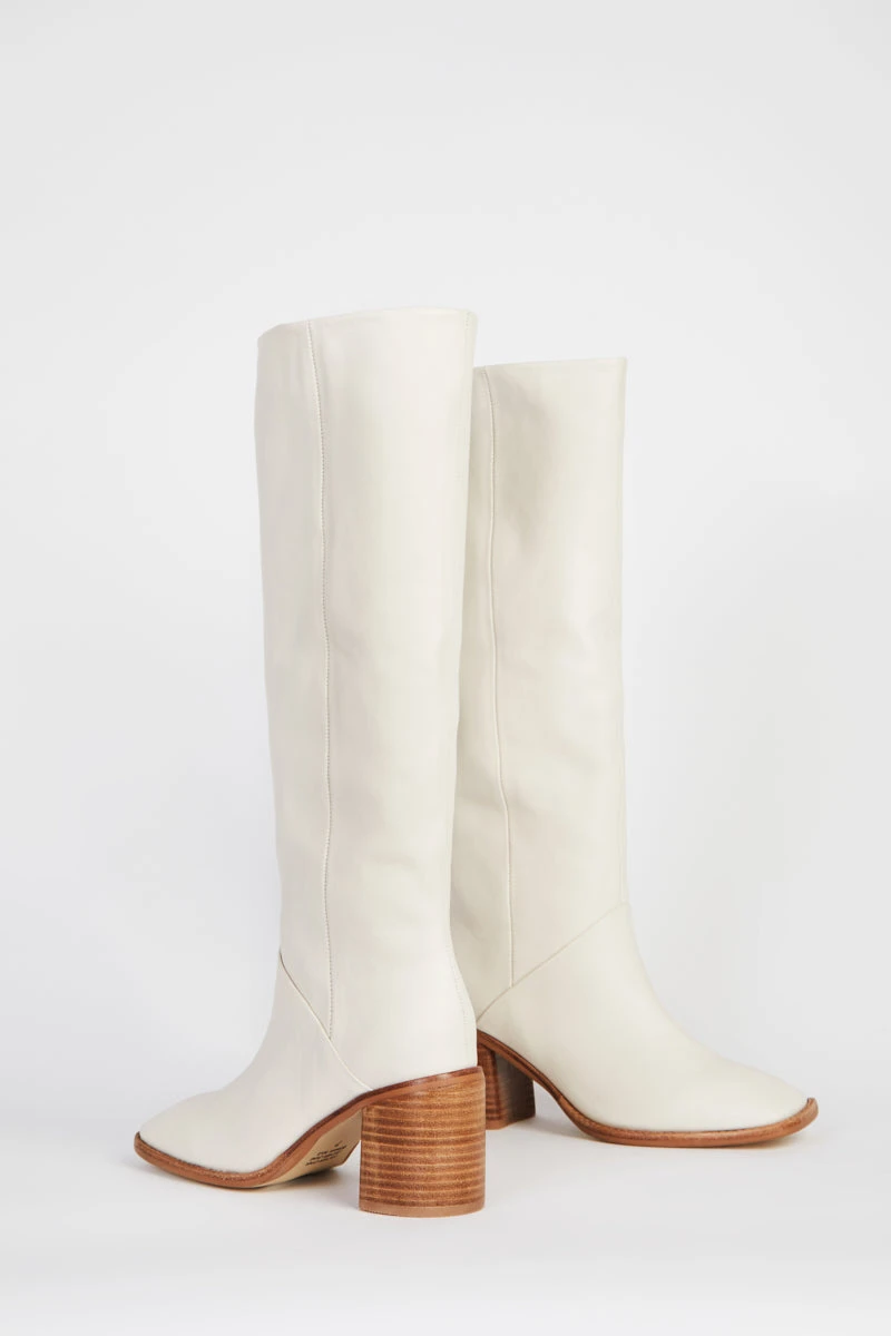 A tall boot that is different. We love the combination of the square two with the straight shaft, wear it bunched down, or tall and straight.