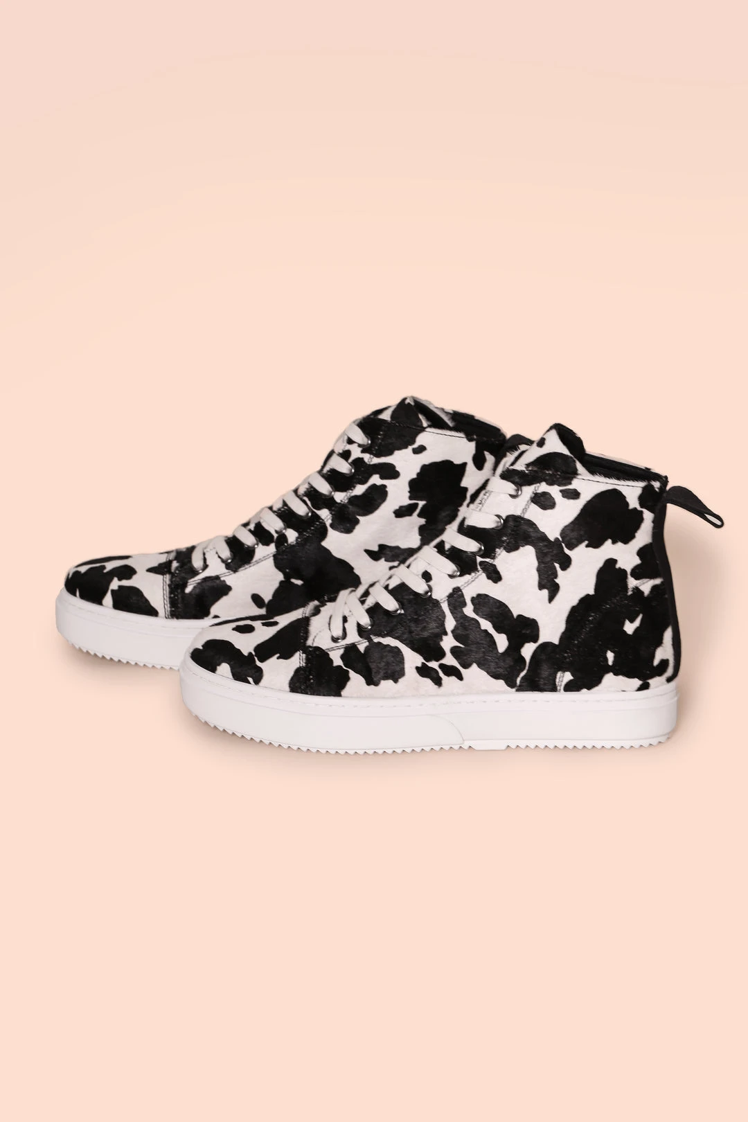MEET JAKE: Our statement hightop. Oversized white rubber base, classic hightop details, make fresh in cow print pony hide.