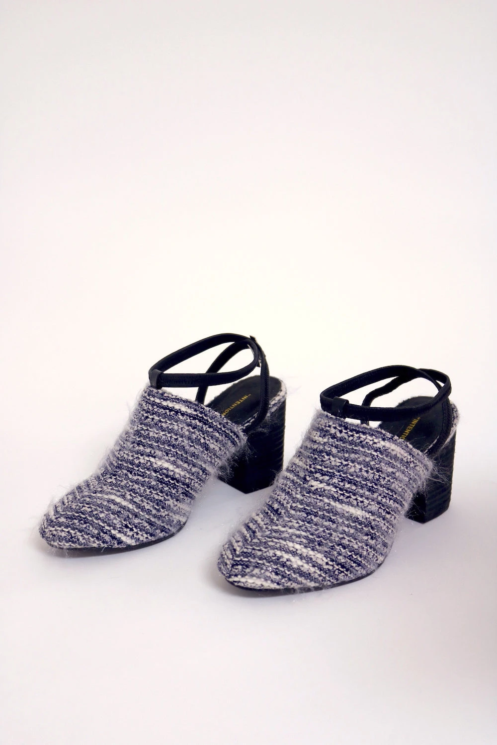 PATRON is back and tweedier than ever. The liquid PATRON is our answer to, well, most life problems, but the shoe version of PATRON is a close second to our favorite beverage. The perfect mule with a criss cross elastic ankle support that is adorable with tights, socks or bare skin. Black tweed and leather lining, combined with a sturdy not-too-high block heel make this such a great shoe for doing all night. Velvet wrapped heel, padded footbed. This shoe is a fall show stopper, and don’t even get me started on holiday parties. We love the texture of this epic shoe.
