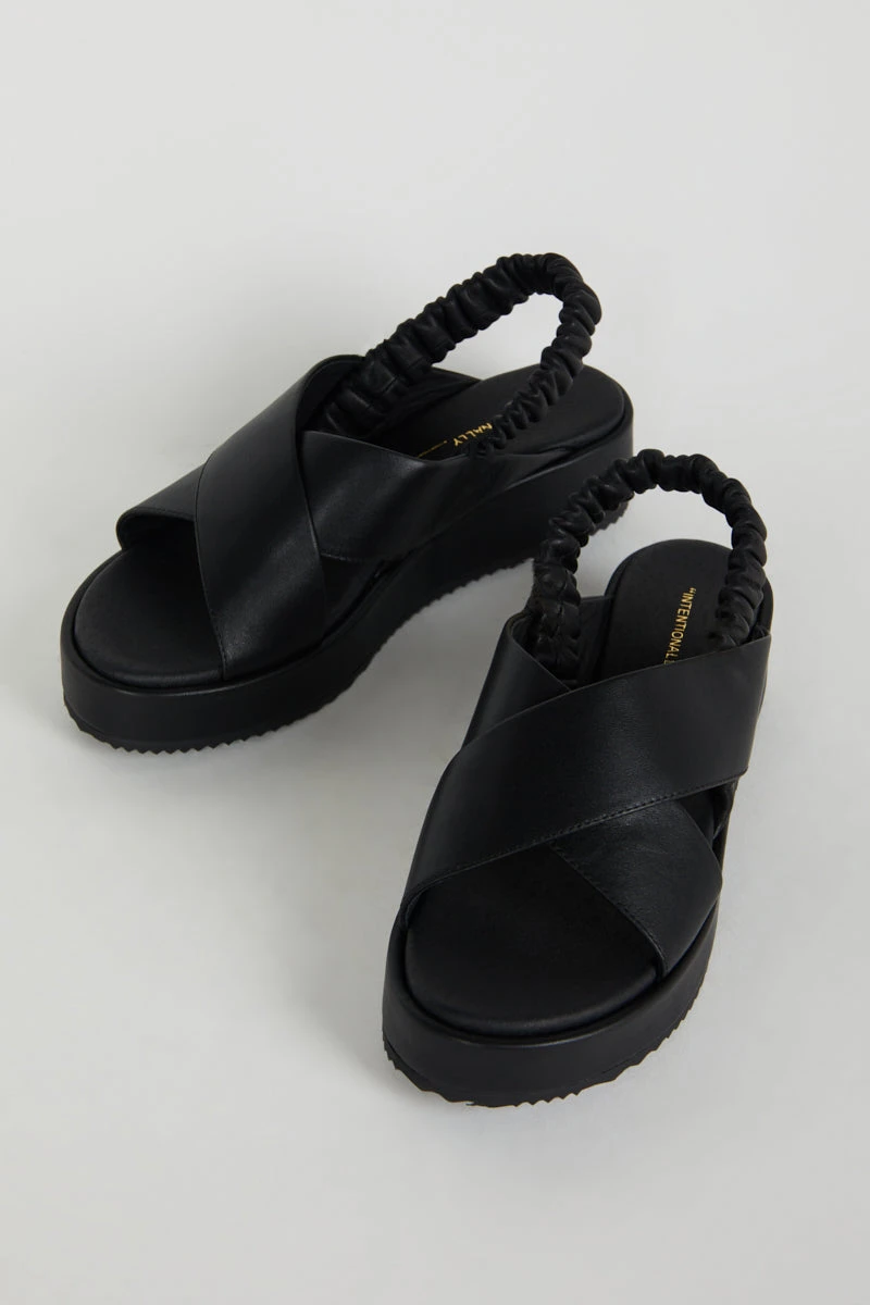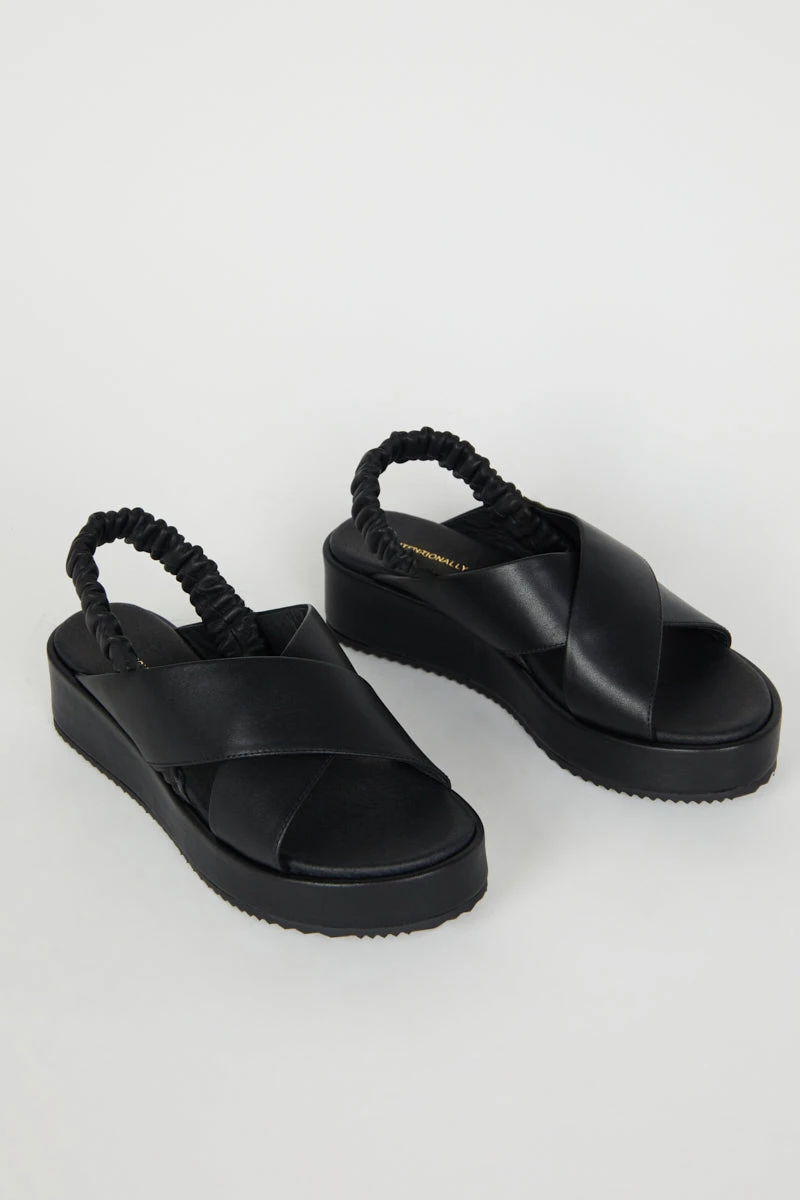 Our updated X-band mini-flatform sandal is back this seaon with a rouched elastic back strap. Casual and elevated all at once, thanks STARRY.