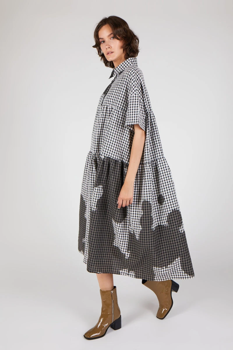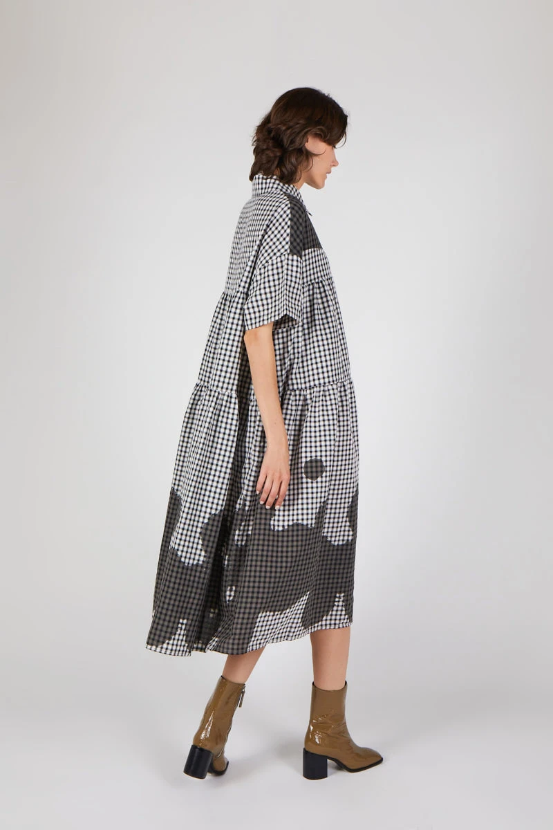 Vintage inspired 90’s dress in gingham with overzied inkblot detail. The perfect oversized piece for year around styling.