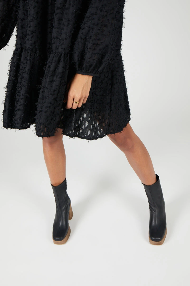The black TENZ dress is the perfect dress for tossing on, and making a statement. Textured with lazer cut details, a baloon sleeve and the perfect length, this dress is simple and impactful all at once.