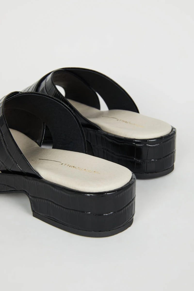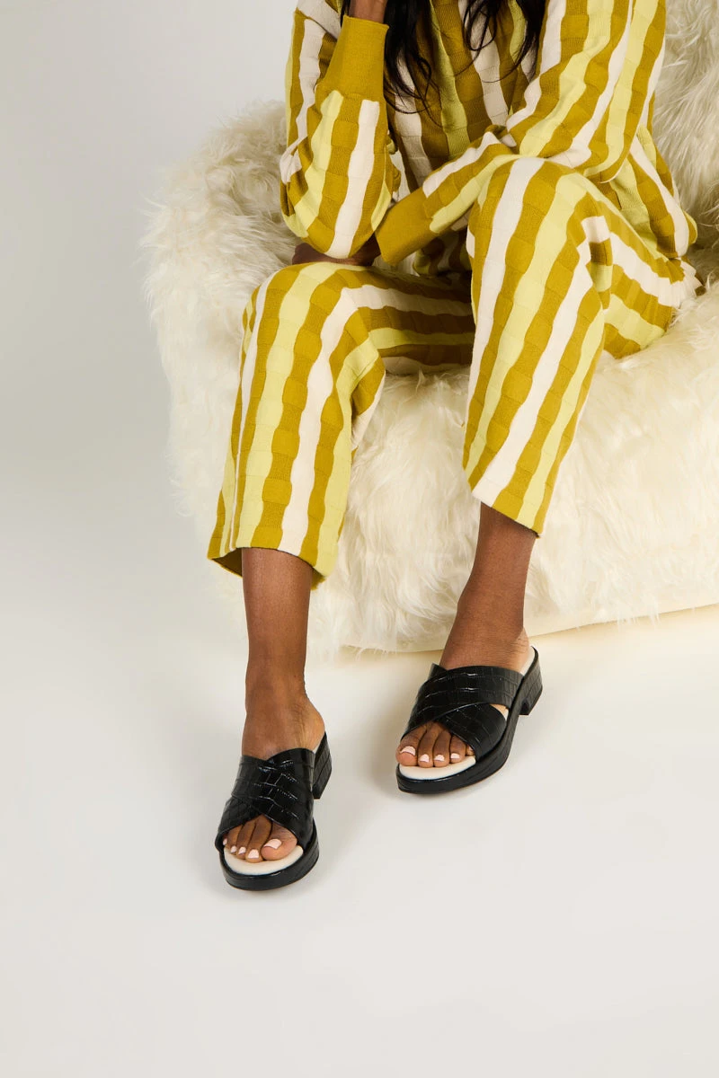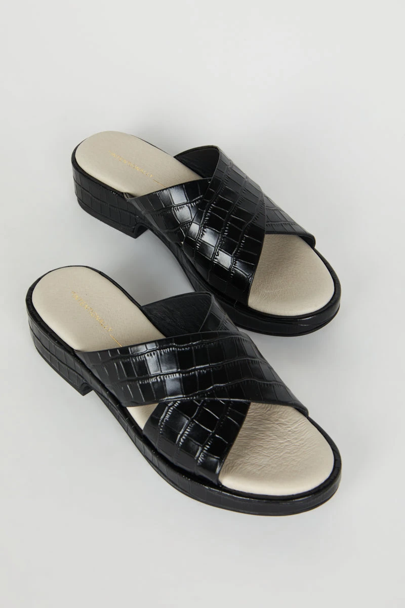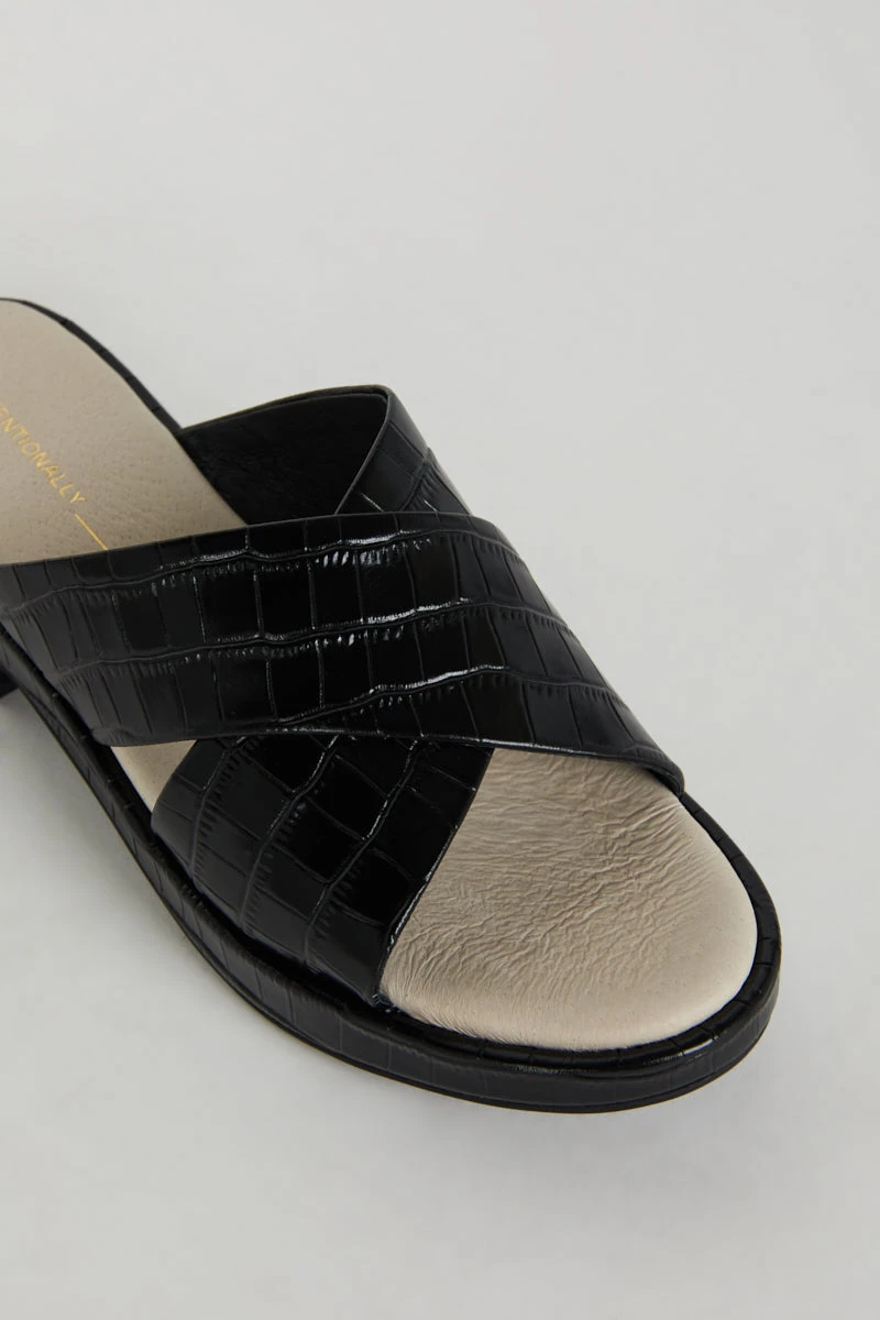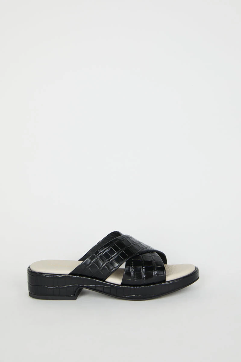 Low and easy this cross band sandal in embossed croco is the perfect warm weather toss on. Meet VONDA, fall in love.
