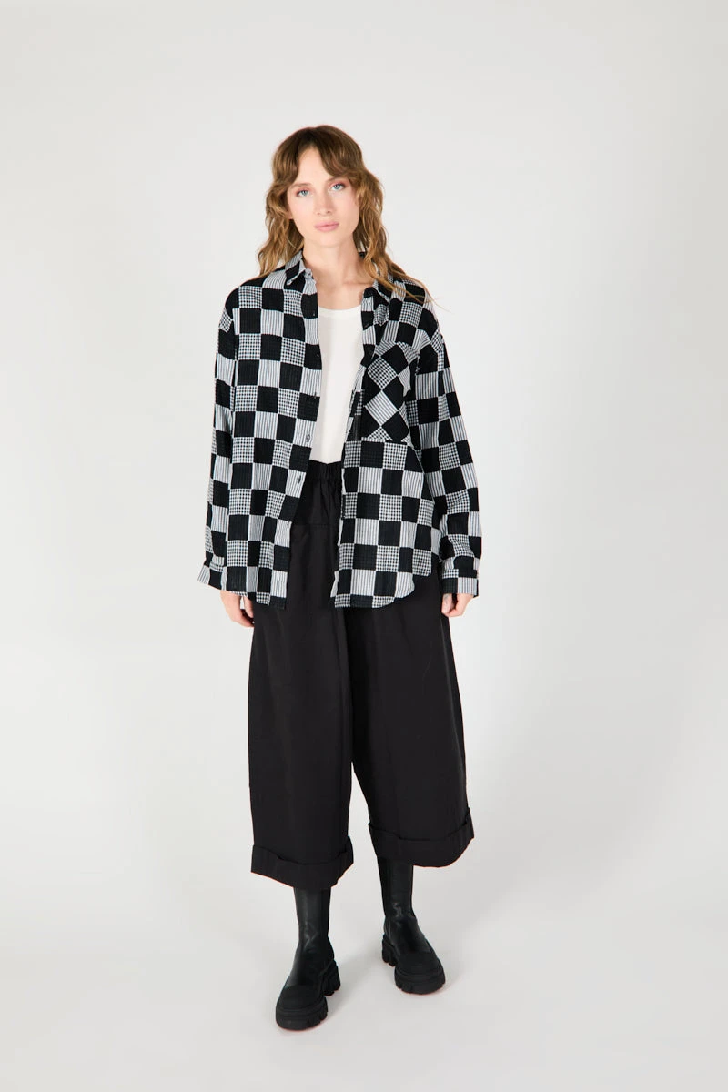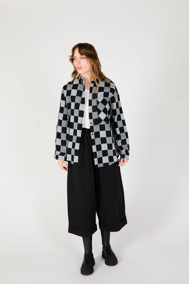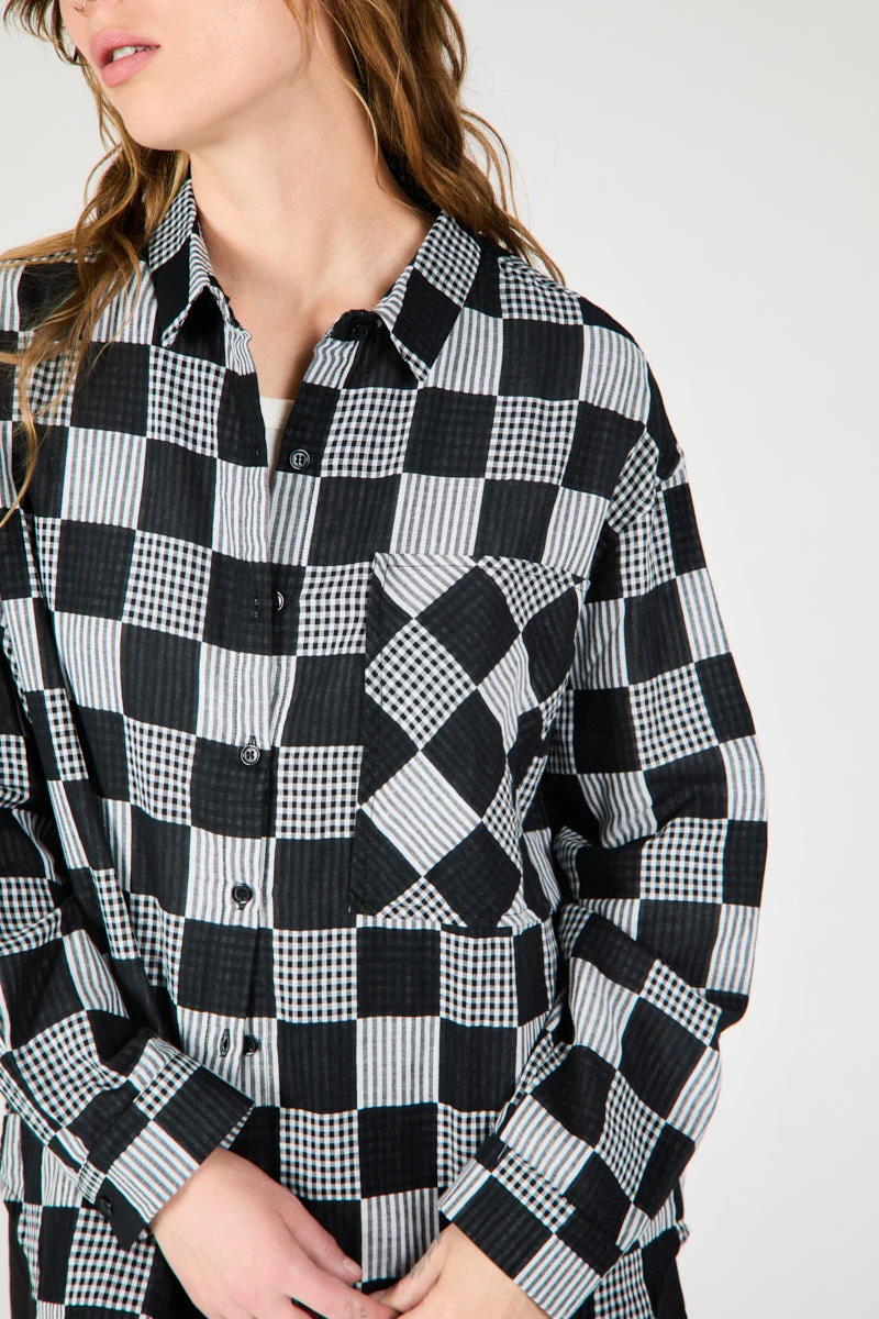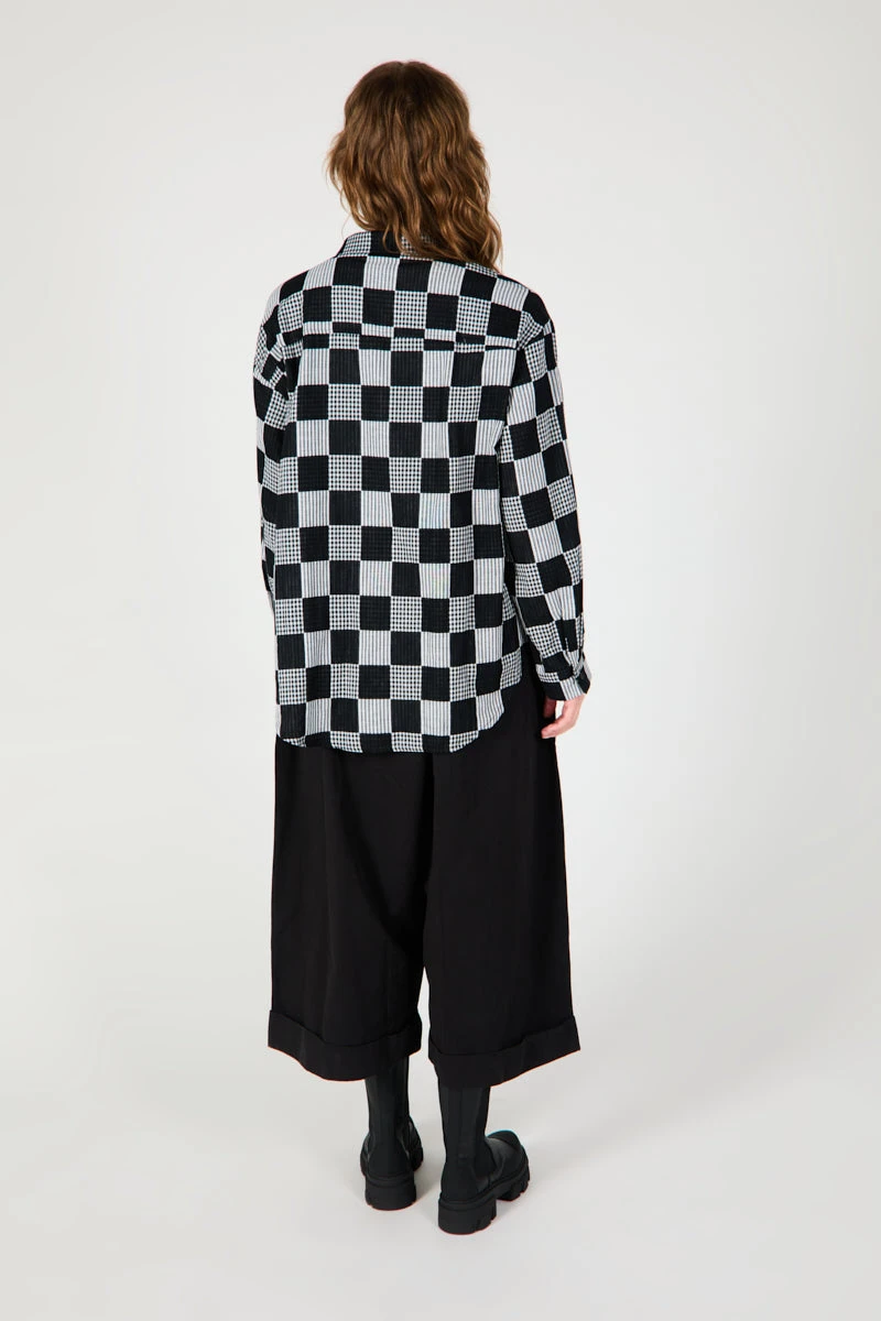 Menswear inspired and perfect for styling, this monochromatic grey scale print is a great piece to toss on when needing to make a statement without the fuss.