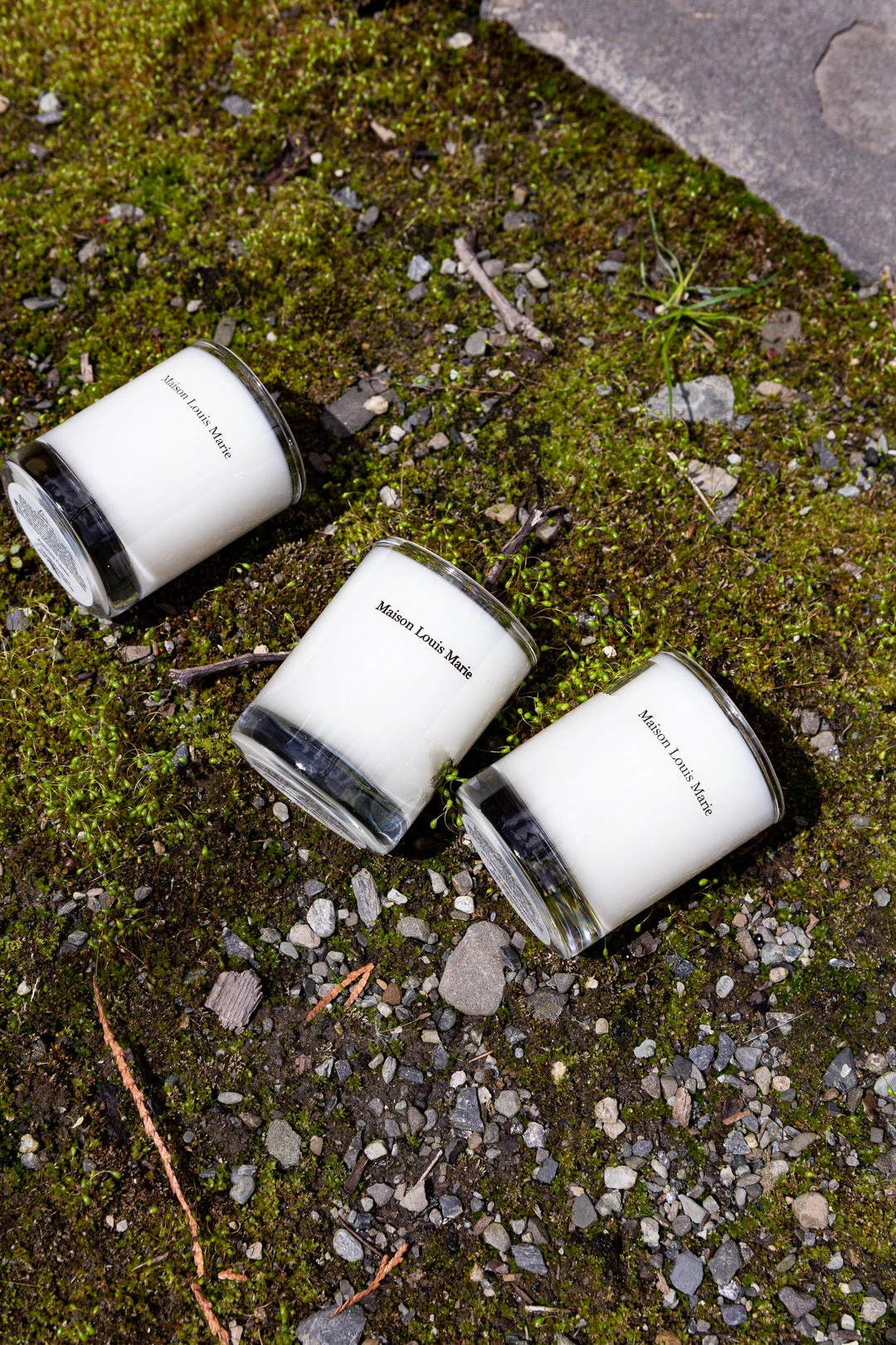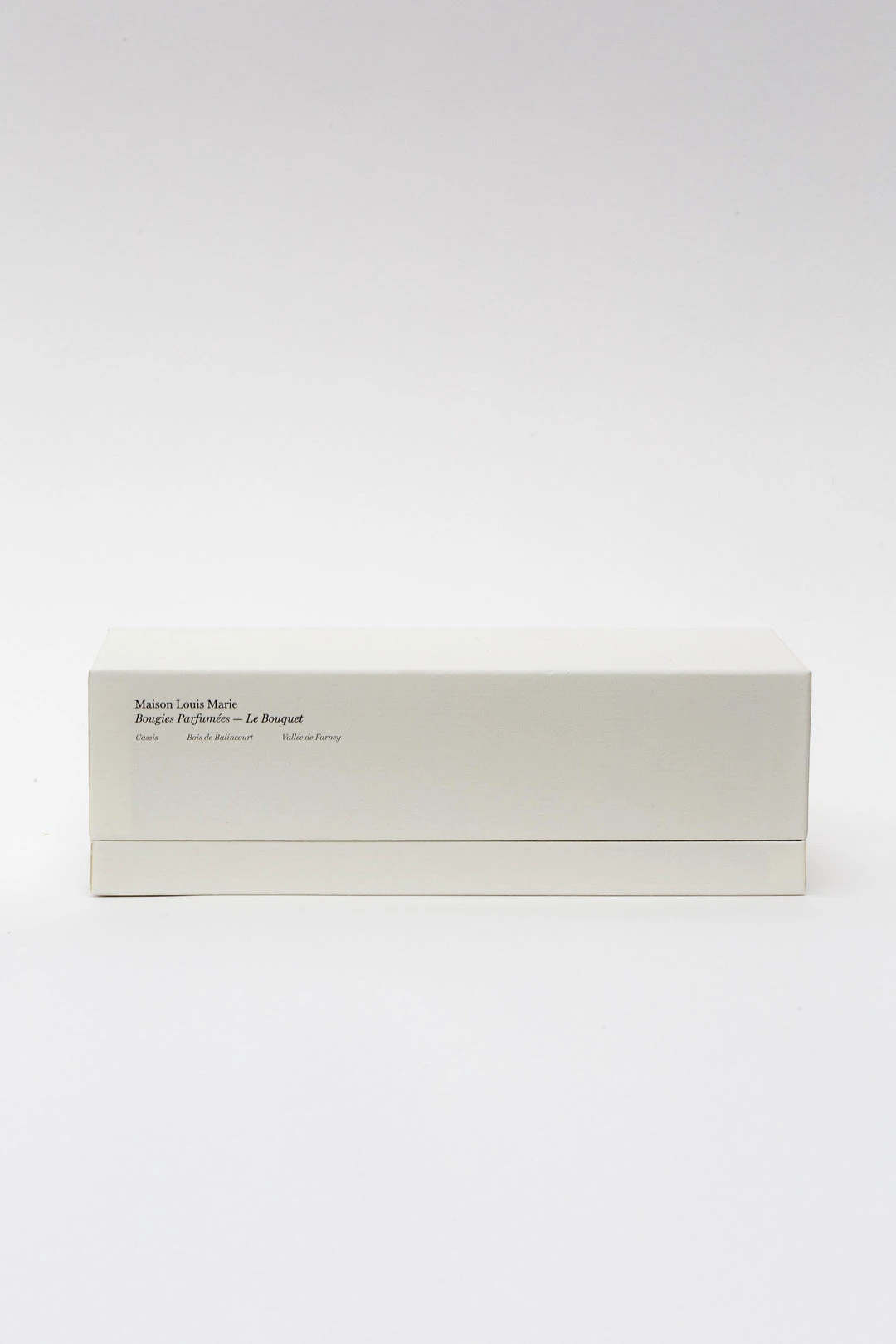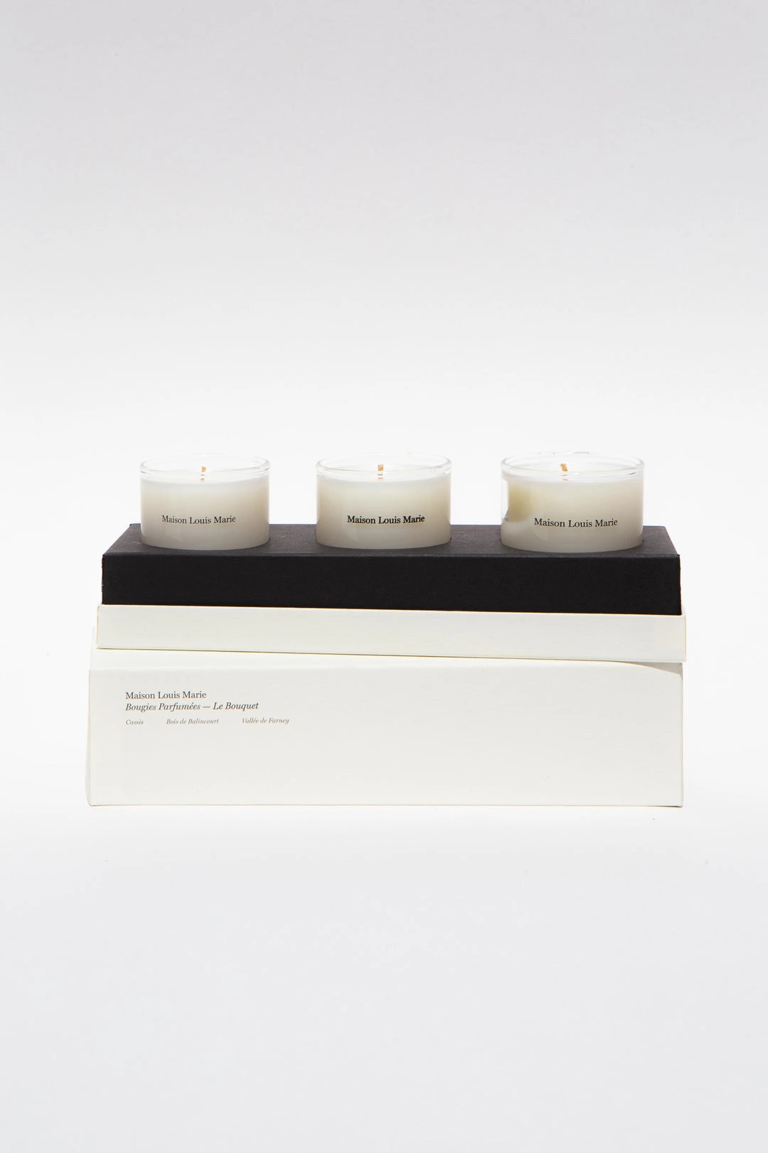 Maison Louis Marie candle Gift Set “Le Bouquet” includes an Antidris Cassis, N0.04 Bois de Balincourt & N0.09 Vallée de Farney votive candles. This set is comprised of 3 scented candles with Cassis & Rose, Sandalwood  & Grapefruit notes.