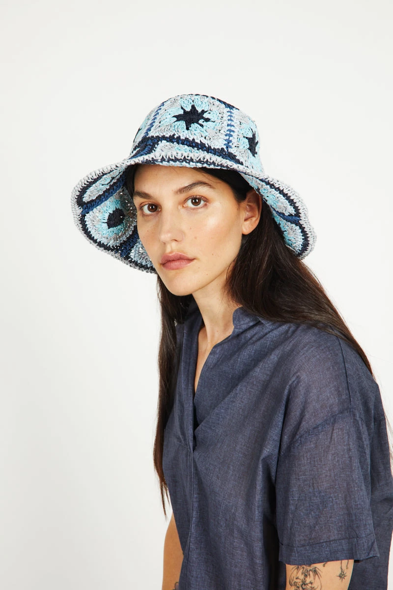 Full vintage hat fantasy in this raffia woven patchwork deep bucket.