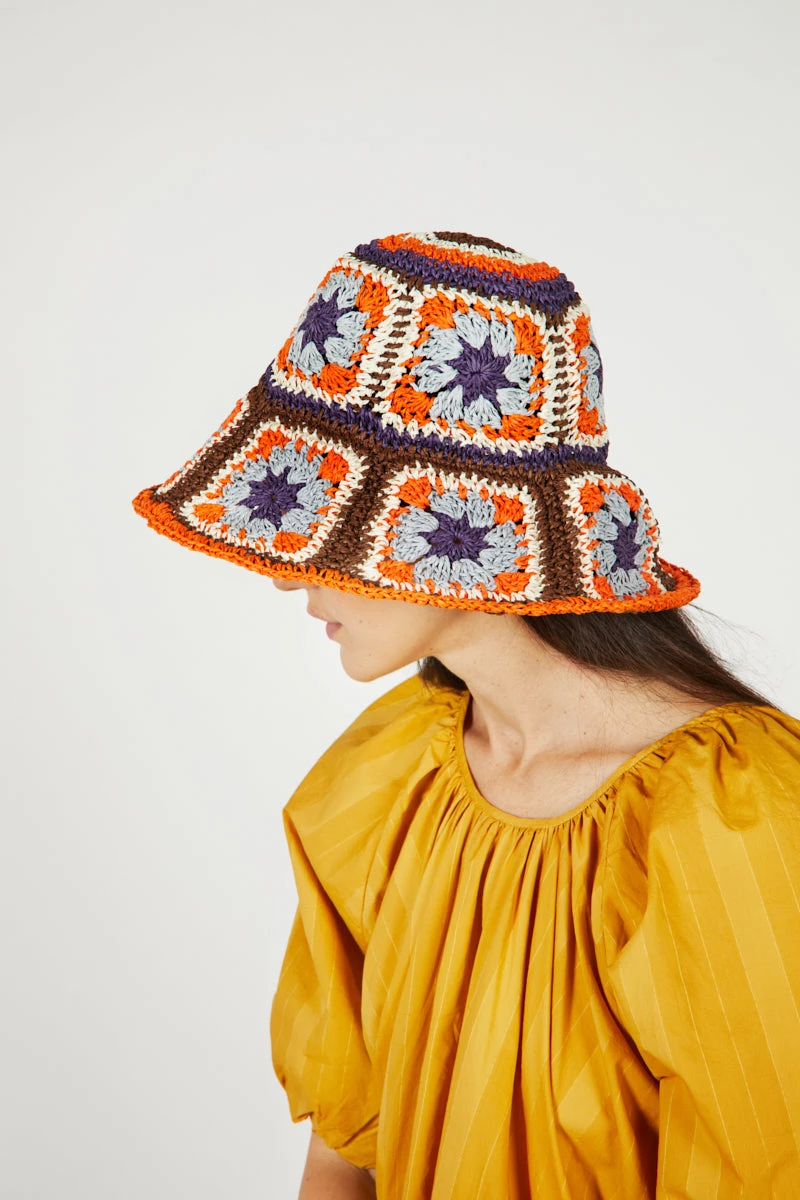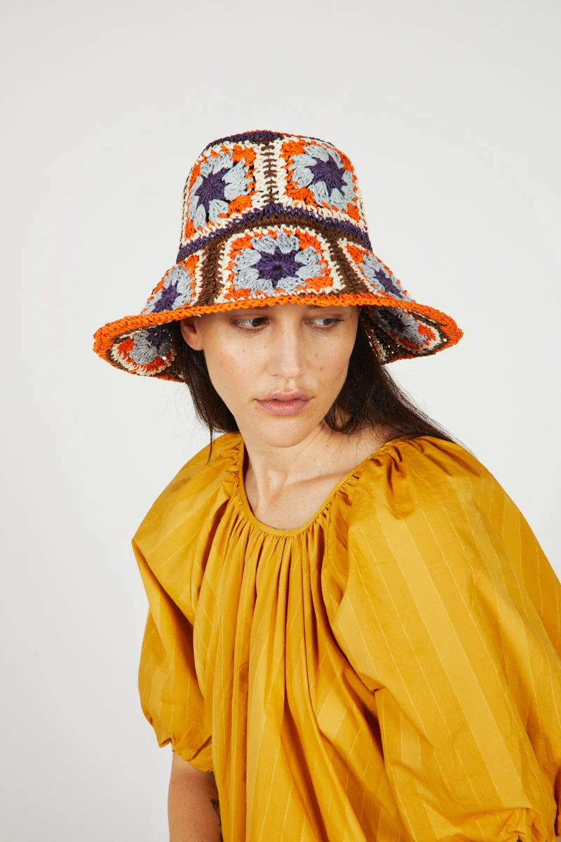 Full vintage hat fantasy in this raffia woven patchwork deep bucket.