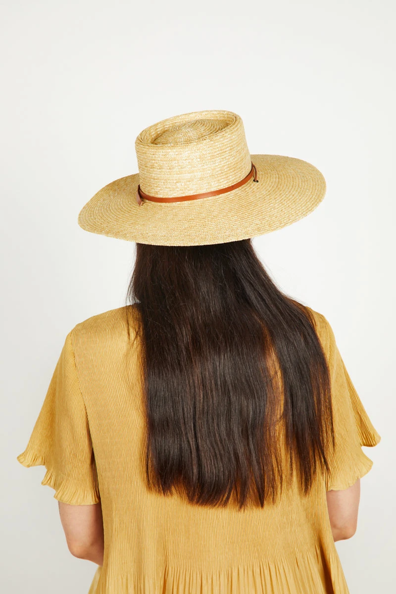 Classic flat brimmed farm hat in the most beautiful woven wheat color combo. Minimal leather band and chicn strap for assured fit and hold.